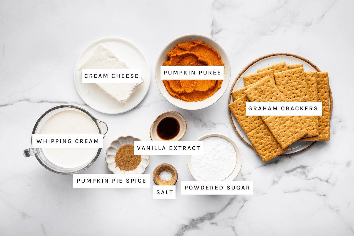 - cinnamon graham crackers – these act as the “cake” layers, softening as they sit with the pumpkin cream. After a few hours in the fridge they turn into the perfect tender base for each slice. You can use regular graham crackers, but I love the added cozy flavor the cinnamon ones add.
